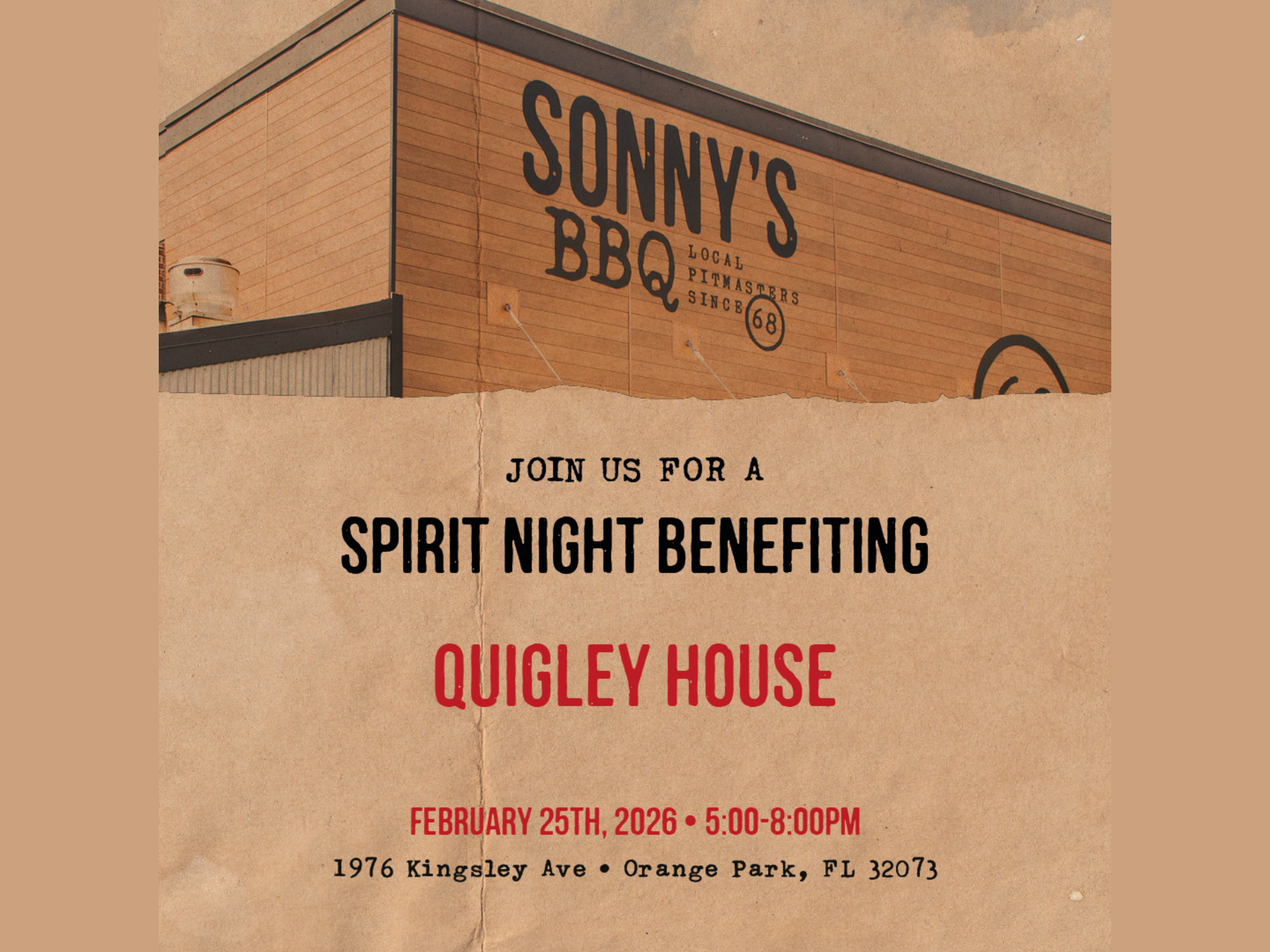 Join us at Sonny’s BBQ on Kingsley Avenue for a give back night this month! Mention Quigley House and show this flyer when ordering to participate